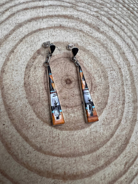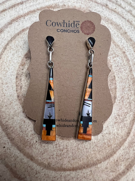 Experience the beauty and craftsmanship of Jason Bobelu's stunning Multi-Stone and Sterling Silver Earrings. Handcrafted with a combination of Turquoise, Coral, Onyx, Spiny Oyster, and Mother of Pearl, these earrings showcase the incredible talent of Zuni silversmiths. Measuring 2 1/4" in length and 1/4" in width, these earrings are both elegant and statement-making.