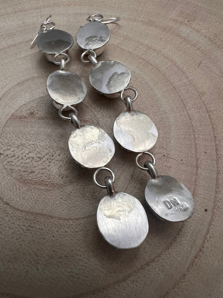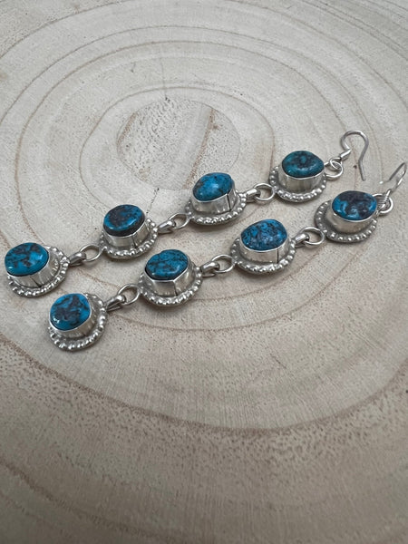 These earrings are made with authentic, hand-picked Kingman Turquoise stones and sterling silver, adding a unique and bold touch to your style. With an approximate 3 inch drop, these statement earrings will help make YOU the statement.