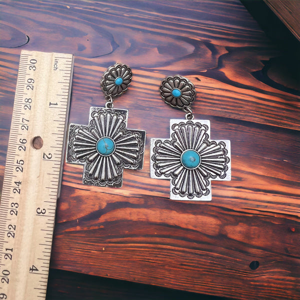 These beautiful silver earrings bring both sparkle and style to your collection! The faux turquoise inlay in the center of the cross-shaped dangle adds a pop of color to any outfit. Take your look to the next level with a touch of turquoise. Get ready to dazzle!
