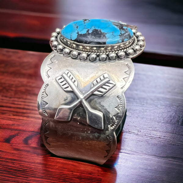 Add a pop of color to your western jewelry collection with this stunning blue Kingman and hand stamped sterling silver Cuff. The beautiful blue hues and intricate patterns of this handcrafted piece are sure to make a statement and elevate any western outfit. Ideal for any occasion, this cuff is a must-have for any fashion-forward individual looking to add a touch of western flair to their wardrobe.