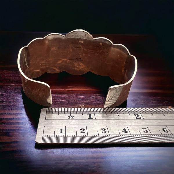 Stamped Dan Dobson Legacy and Sterling. The cuff measures 1 1/2 inch wide and has a 1 1/4 inch opening. The cuff is slightly pliable to adjust to most wrists.