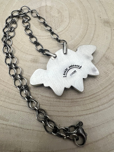 The pendant is hallmarked with Bobby Johnson’s signature and sterling mark, ensuring authenticity and quality. Perfect for those who appreciate authentic Native American artistry, this necklace blends traditional craftsmanship with timeless style.