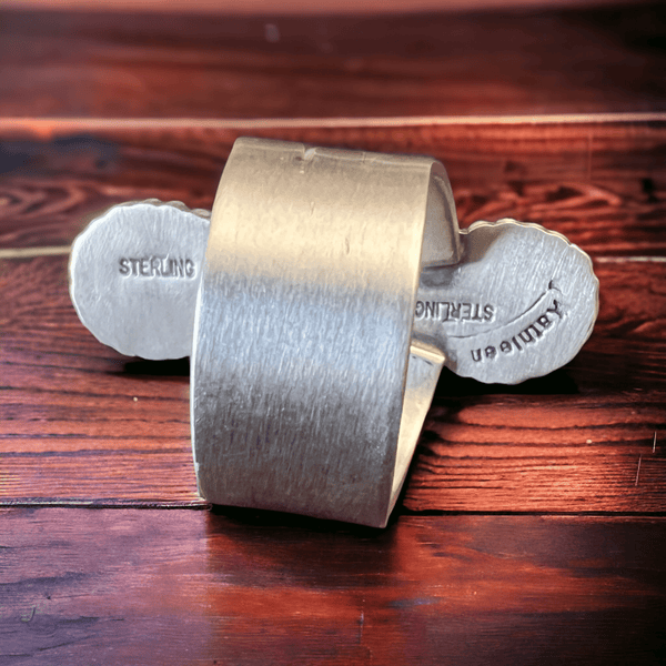 This beautiful ring is created by silversmith Kathleen Livingston, a Navajo artist known for her stunning craftsmanship. Made with the finest materials, including sterling silver and Sonoran Gem Turquoise, this ring is a size 7.5 and measures 1 3/8" in length and 1/2" in width. It is also stamped with the hallmark of Kathleen Livingston herself, ensuring its authenticity and quality.