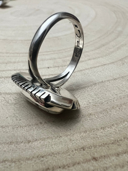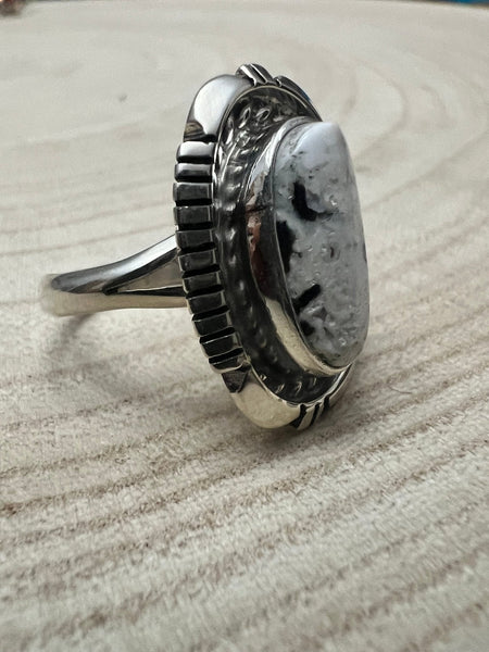 Experience the spirit of the West with the Norvin Johnson Navajo Handmade White Buffalo Ring, size 8. Crafted by skilled Navajo artisans, this ring features a stunning white buffalo stone, symbolizing purity and strength.