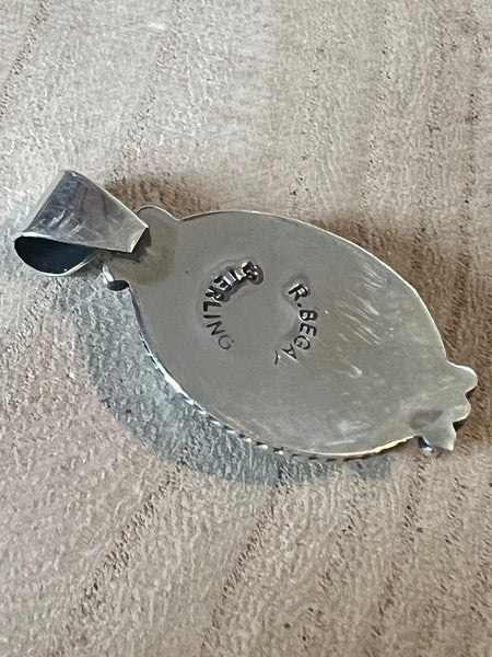 Crafted by renowned Navajo silversmith Rena Begay, this pendant showcases a stunning piece of Sonoran turquoise set in high-quality sterling silver. Measuring 1 1/8" in length and 5/8" in width, it features the hallmark "R. Begay, Sterling," ensuring authenticity and craftsmanship.