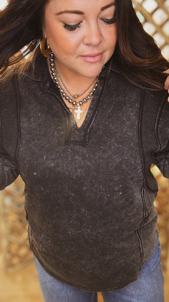 This washed black pullover brings effortless style with its split collared neck and cool raw hem. The ribbed details add a fun twist that keeps your look fresh and comfy, perfect for layering or rocking solo on casual days.
