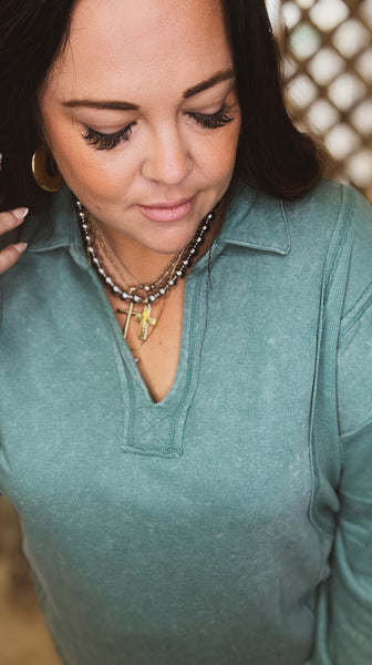 Cozy up in the Meadow Dust Pullover, featuring a trendy sage collar and a fun split V-neck design. With its relaxed scoop bottom, this sweatshirt offers a perfect blend of comfort and style—ideal for laid-back days and playful adventures.
