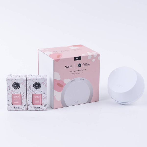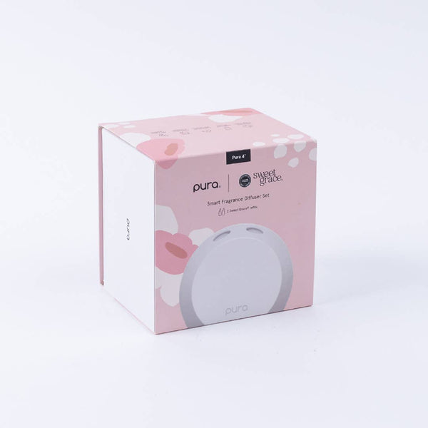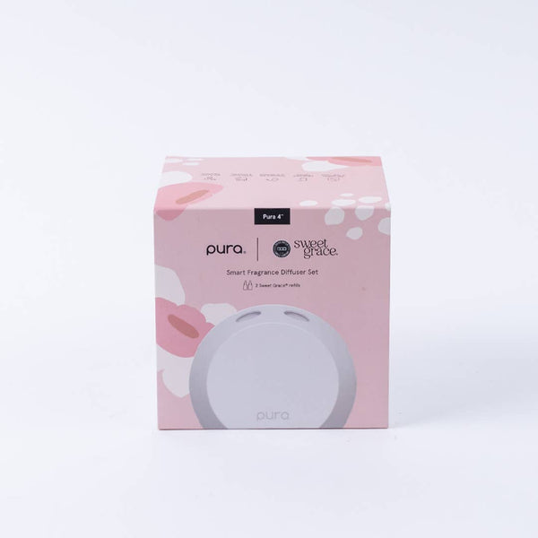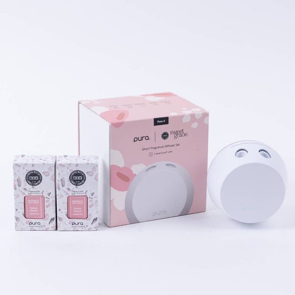 Introducing the Pura Air Freshener Version 4 with Smart Vials - the ultimate scent solution for your space. With its sleek, slim design and 500 square feet of coverage, this plug-in device fills your room with delightful fragrances. Control your scent experience via the Pura app, set schedules, and easily swap between two scents using the innovative Smart Vial clips. Enjoy adaptive, climate-controlled fragrance diffusion for a consistently pleasant aroma. Elevate your space with the Pura Air Freshener Version 4 and indulge in a sensory haven of delightful scents. Kit includes 1 Pura Smart Home Diffuser device and 2 Sweet Grace PURA Smart Vials.