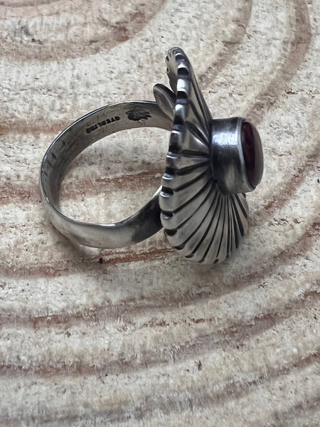 This handcrafted ring was made by Navajo artist Raymond Coriz, known for his stunning craftsmanship. Experience the unique beauty in a one-of-a-kind piece of jewelry made of sterling silver and purple spiny Oyster.