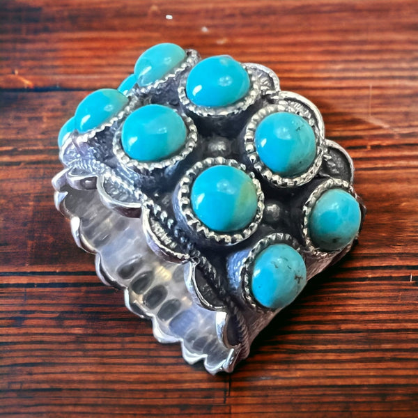 This Kingman Sterling Ring (10 stones) boasts a classic and timeless design. Perfect for everyday wear or dressing up for a special occasion, this ring adds an elegant touch that will draw attention to your hand. Elevate your style with this stunning piece and make a statement that is both sophisticated and effortless.