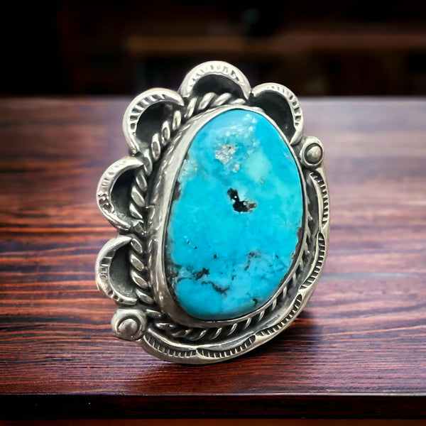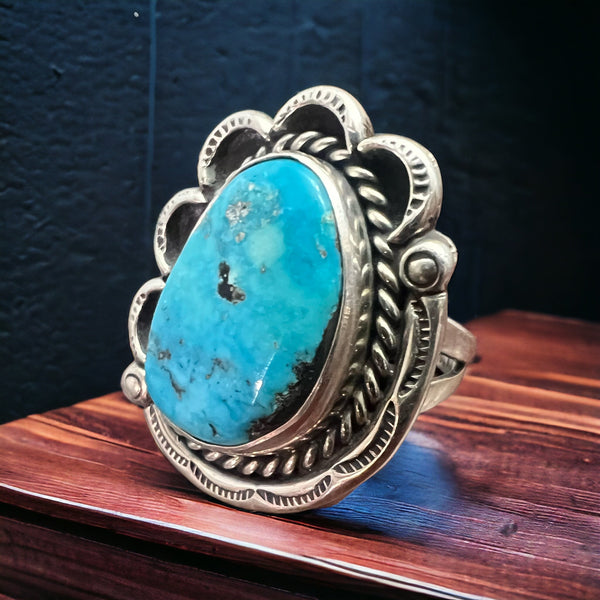 Turquoise Ring - Gorgeous Blue & Hand stamping - Size 7