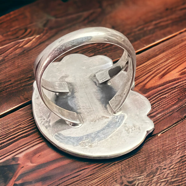 This stunning Turquoise Ring features a gorgeous blue stone and delicate hand stamping on sterling silver, making it a unique and eye-catching piece. Available in size 7, it's the perfect addition to any jewelry collection.