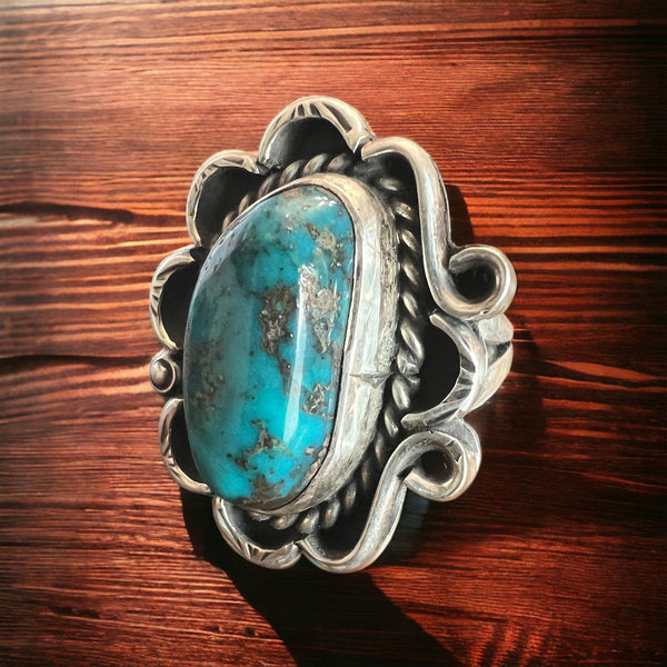 Turquoise ring - gorgeous large cabochon on sterling flower shaped base - size 7