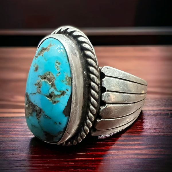 Experience the exquisite charm of this authentic turquoise ring on a wide sterling band.
