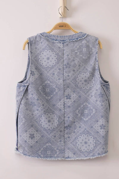 Effortlessly chic meets whimsical charm in this paisley-printed chambray vest. The sleeveless silhouette and relaxed V-neckline create an airy, versatile layer perfect for spring styling. Button-down front with practical patch pockets keeps things functional, while the frayed hem adds a touch of carefree character. Crafted from a breathable cotton-polyester blend, it's the ideal piece to throw over your favorite tee or dress up with tailored pieces.
