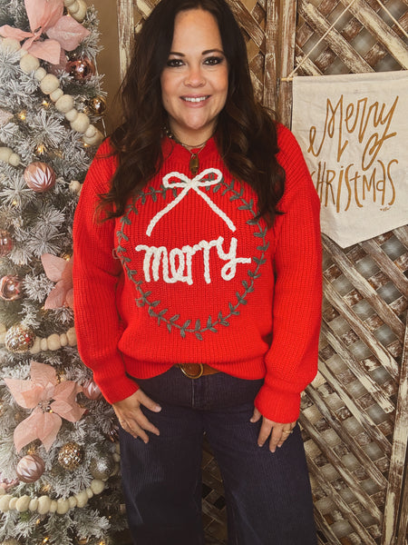 Wrap yourself in holiday cheer with this charming knitted sweater featuring a vintage-inspired wreath design in rich green and ivory yarns across the front. The word "Merry" sits nestled in the center, spreading festive joy with every wear. Crafted in a warm red base, this playful piece brings nostalgic elegance to your seasonal wardrobe. Perfect for cozy gatherings, holiday parties, or simply celebrating the spirit of the season in style.