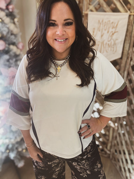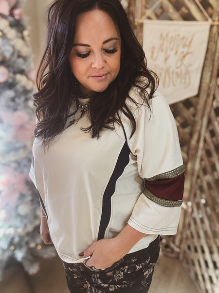 Throw it back to your glory days in this colorblock varsity top! Crafted from soft French terry, this half-sleeve beauty features a striking cream, navy, and burgundy color-block design that's anything but basic. The vintage gold detailing adds just the right amount of retro charm to keep things fresh and fun. Perfect for casual Fridays, weekend hangouts, or whenever you're channeling your inner athlete-chic vibe. Cozy, stylish, and totally Instagram-worthy.