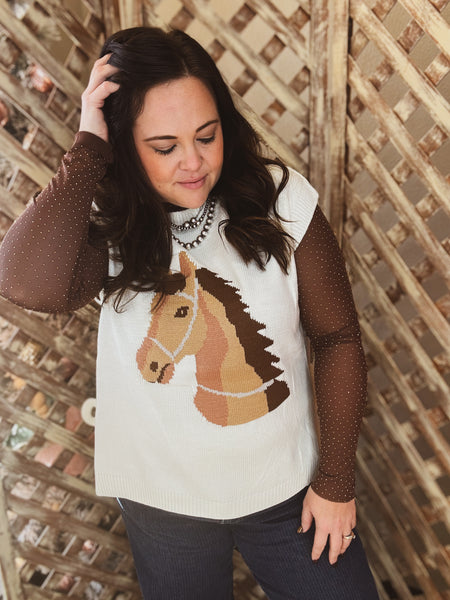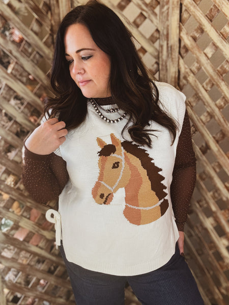 Saddle up in style with this eye-catching Mauve Mustang Sweater Knit Top. Crafted from soft 100% acrylic, this sleeveless beauty features a chic mauve hue that pairs perfectly with your favorite denim or skirts. The side slit adds movement and flair, while the tie detail at the waist creates a flattering silhouette that's equal parts cozy and sophisticated. Whether you're channeling your inner cowgirl or just love a touch of western-inspired charm, this versatile knit top is ready for anything from casual outings to weekend adventures.