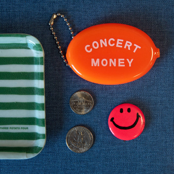 This pouch is translucent neon orange with a sweet vintage-inspired "Concert Money" message in white.