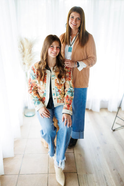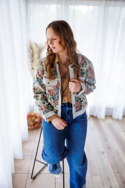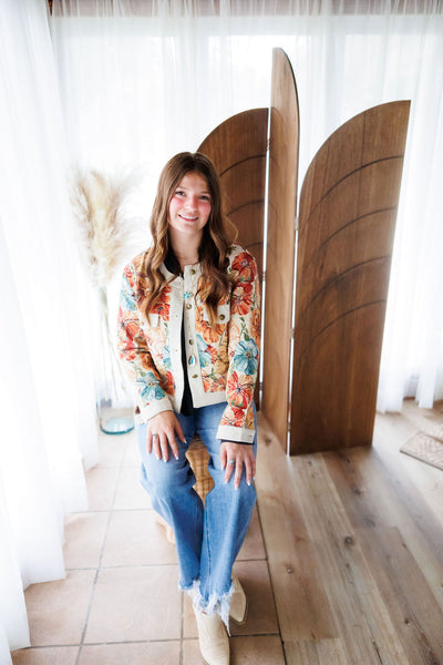 This playful jacket features a charming flower jacquard pattern paired with solid woven contrast details for a fresh, stylish look. The button-down front and round neck add classic touches, while the relaxed fit ensures comfort and ease all day long. Perfect for adding a fun twist to your everyday wardrobe!