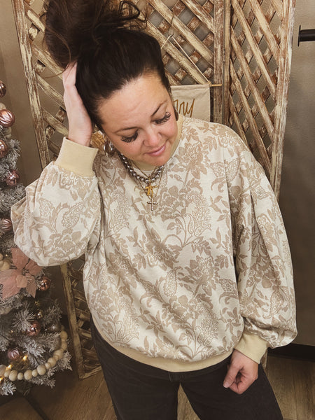 Cozy up in our Winter Meadow Top, where comfort meets charm! This oversized knit sweater features a gorgeous floral print with a relaxed drop shoulder silhouette that's perfect for effortless style. Pleated sleeves add a playful touch, while ribbed detailing at the cuffs, neckline, and hem keeps everything polished. Best of all? Functional pockets mean you can keep your hands warm and your essentials close. Layer it over your favorite basics for a look that's as comfortable as it is cute.
