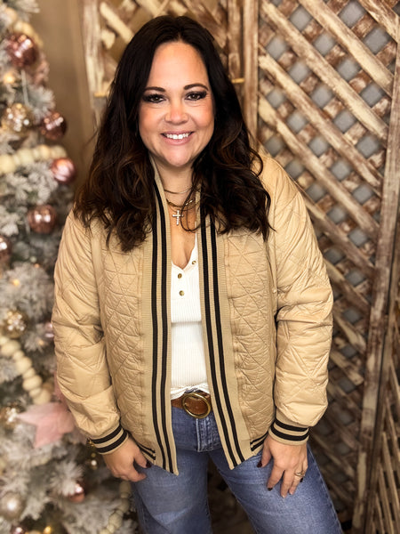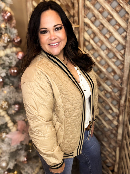 Layer up in style with the Stop & Stare Jacket—a quilted open cardigan that delivers warmth without the weight. The lightweight, padded nylon exterior keeps you cozy, while the open front makes it perfect for mixing and matching with your favorite pieces. Practical side slant pockets add function to the fashion, and playful striped ribbed trim on the cuffs and hem gives it an unexpected pop of personality. Throw it on over anything and turn heads effortlessly.