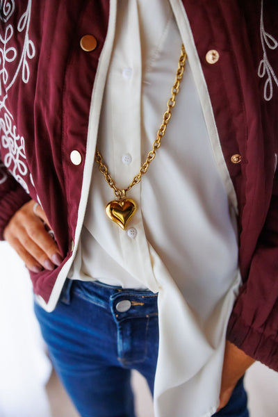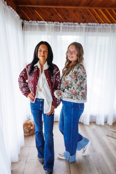 Wrap yourself in cozy charm with the Scenic Route Jacket. Crafted from midweight quilted cotton with a soft matte finish, it features oversized floral embroidery that pops against the fabric. The bomber-style silhouette, complete with voluminous balloon sleeves and elastic cuffs, adds playful flair, while side pockets bring handy convenience. Fully lined for comfort and structure, this Western-inspired jacket is perfect for layering warmth and character into any outfit.