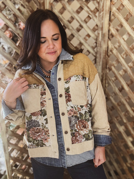 Layer up in style with the Fireside Fade Jacket, where cozy meets creative. This playful patchwork piece blends rich corduroy solids with charming floral tapestry panels, all anchored by a quilted yoke for extra warmth. The relaxed silhouette drapes effortlessly over everything from sweaters to dresses, making it the perfect jacket for those in-between seasons when you want personality and comfort in one piece.