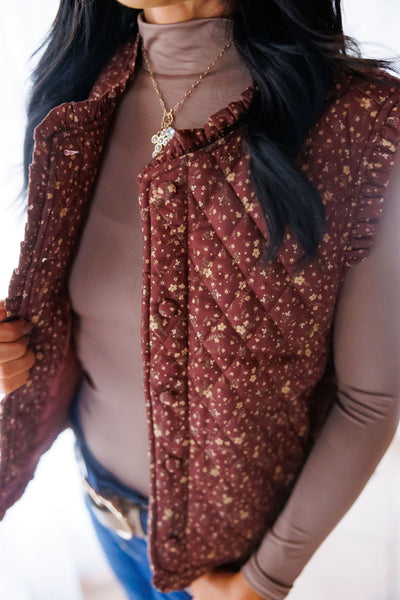 Add a dash of charm to your layering game with the Hands Of Time Quilted Vest. Crafted from ditsy print woven fabric, this sleeveless vest features playful ruffle details and a cozy quilted design. The button-down front and relaxed fit make it easy to wear solo or over your favorite tops for a fun, flirty look all season long.