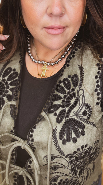 Elevate your style with the Midland After Midnight Vest, featuring a playful blend of punched crochet suede in rich olive and black. Designed with three stylish ties, this vest adds a touch of fun and flair to any outfit, making it the perfect layering piece for a bold, adventurous look.