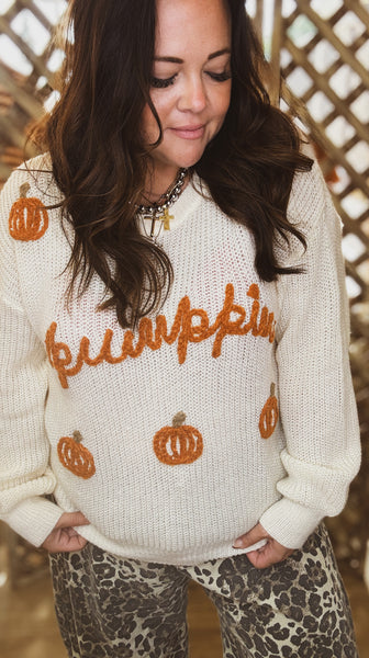 Celebrate the cozy season with this lightweight sweater featuring charming yarn-stitched pumpkins and the word "pumpkin" playfully embroidered across the front. Perfect for crisp autumn days, its soft fabric keeps you comfy without weighing you down, making it your go-to for pumpkin patch adventures or casual fall fun. Add a touch of festive flair to your wardrobe with this adorable, easy-to-wear sweater.