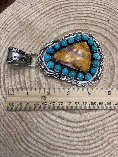 Introducing the remarkable Roland Dixson Spiny Oyster, Turquoise & Sterling Silver Pendant, skillfully crafted by renowned Navajo silversmith, Roland Dixson.