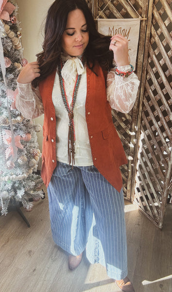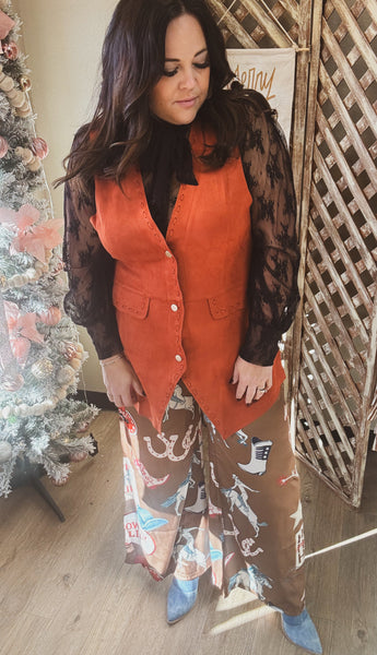 Saddle up in style with this faux suede midi vest that's giving major cowgirl energy. Featuring a sleek snap button closure and a longline silhouette, it's the perfect layering piece for rodeo vibes, boho adventures, or everyday casual wear. Available in rich rust and classic black, this versatile vest channels vintage Western charm while keeping things effortlessly chic. Throw it over your favorite tee or dress it up for a statement look that's pure Pearls & Lace magic.