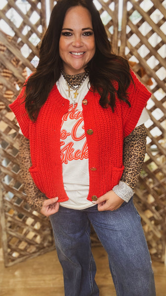 Make a bold statement in this bright red sweater vest, perfect for adding a pop of color to any outfit. Its standout feature? Large gold hammered buttons that catch the light and bring a playful touch to your look. Cozy, chic, and unforgettable—this vest is ready to become your new favorite layering piece.