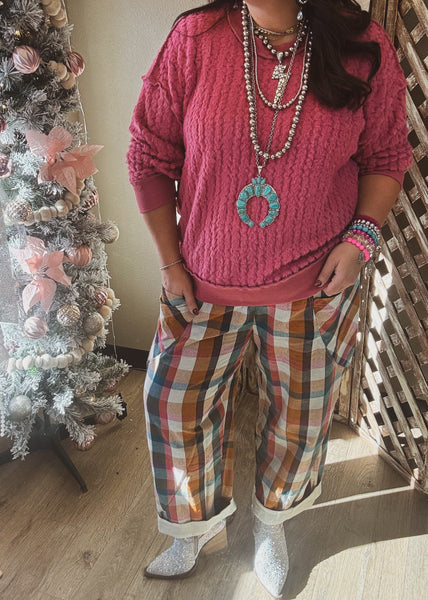 Elevate your casual wardrobe with these Triple Crown Pants—a playful blend of rose, teal, and plaid that brings personality to every outfit. Designed for comfort and style, these lightweight baggy pants feature an adjustable elastic and tie waist for the perfect fit, plus deep side pockets that actually hold your stuff. Whether you're lounging at home or stepping out for an adventure, these pants deliver effortless cool with a fun twist.