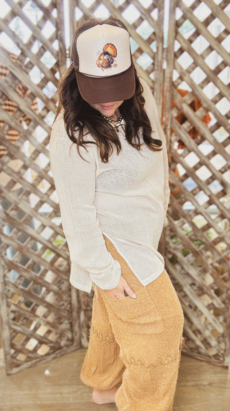 Celebrate the season with this Turkey Trucker Hat, featuring a colorful fall turkey design that pops against a cozy brown and oatmeal backdrop. Perfect for adding a playful, festive touch to your autumn wardrobe, this hat combines comfort with charming seasonal flair. Stay cool and stylish while showing off your Thanksgiving spirit wherever you go!